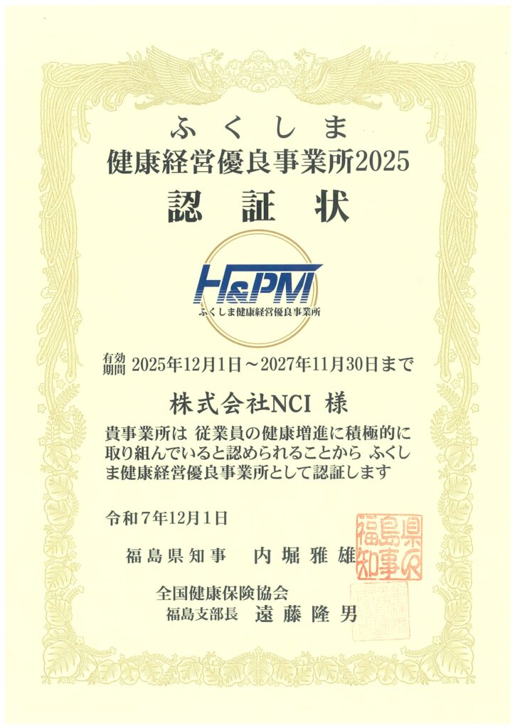 福島県が実施する 「ふくしま健康経営優良事業所2025」 に認定されましたのでお知らせいたします。