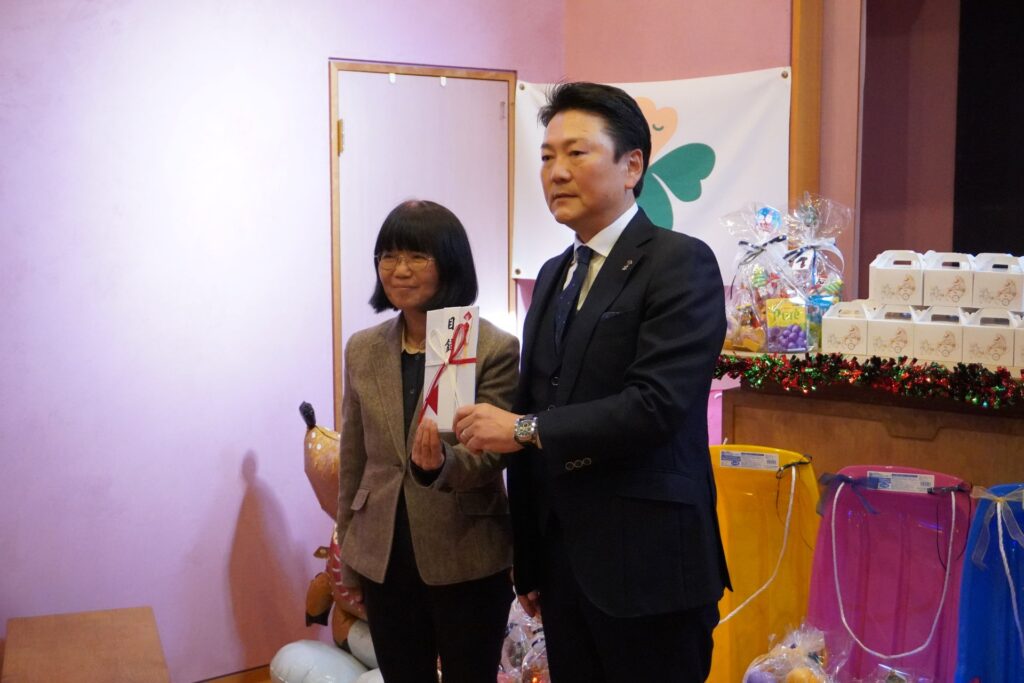 クリスマスプレゼントとしてケーキやお菓子の詰め合わせ、雪遊びソリ・雪玉作りおもちゃなどもお贈りいたしました。